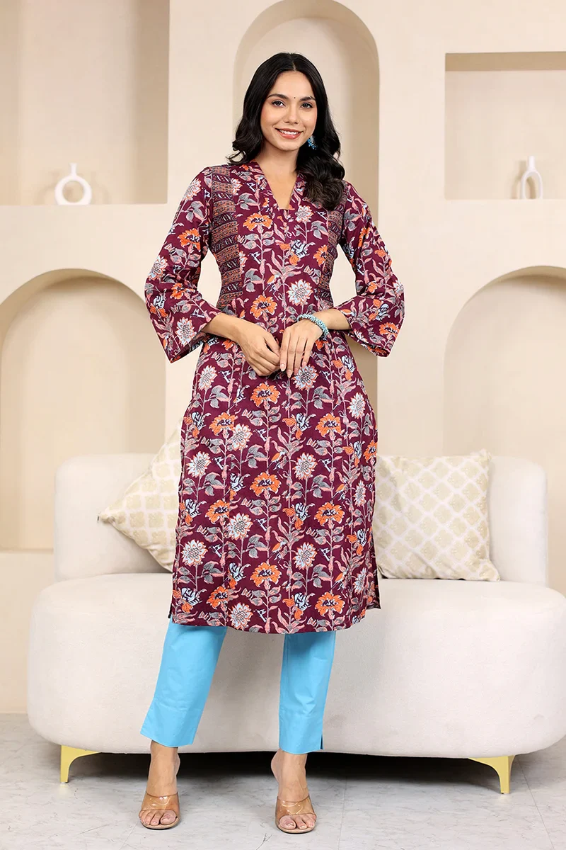 Dark Purple Straight Cotton Kurta with Printed Side Panels